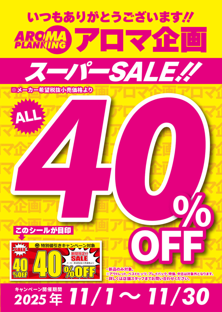 キャンペーン情報 ポイントカードについて 店舗情報 買取について 求人案内について 新品DVDキャンペーン(アロマ企画) 40%オフ!! 2025年11/1日(土)~スタート!! 2025.11.01 (土) 吉島店 廿日市店 西条店 新品DVD[アロマ企画] 40%オフキャンペーン スタートいたします!! キャンペーン詳細 新品DVDが対象です アウトレット、ベストヒッツ、中古商品 特価商品は対象外です。 新品価格(店頭販売価格)から40%オフとなります。 キャンペーン期間: 2025年11月1日(土)~2025年11月30日(日) 閉店時まで 開催店舗 東京書店吉島店 東京書店西条店 東京書店廿日市店 この機会にお近くの東京書店までお越しください。 ご来店お待ちしております。 眠れぬ夜は東京書店!! 一覧 TOPページ