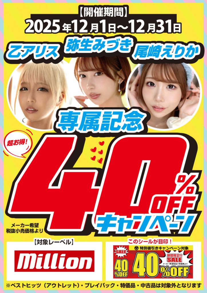 新品DVDキャンペーン(ミリオン) 40%オフ!! 2025年12/1日(月)~スタート!!