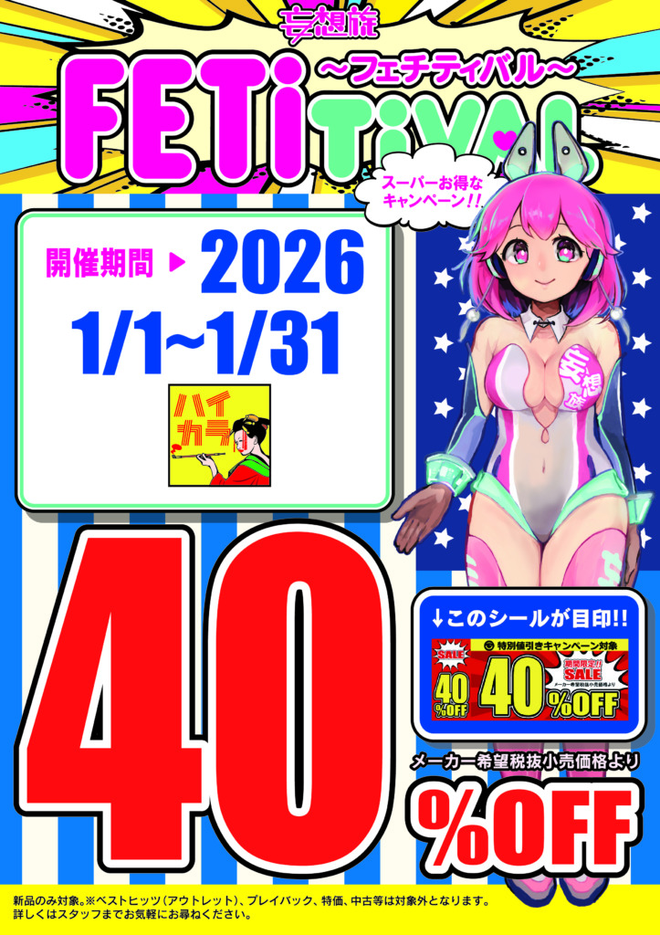 キャンペーン情報 ポイントカードについて 店舗情報 買取について 求人案内について 新品DVDキャンペーン(ハイカラ/妄想族) 40%オフ!! 2026年1/1日(木)~スタート!! 2026.01.01 (木) 吉島店 廿日市店 西条店 新品DVD[ハイカラ/妄想族] 40%オフキャンペーン スタートいたします!! キャンペーン詳細 新品DVDが対象です アウトレット、ベストヒッツ、中古商品 特価商品は対象外です。 新品価格(店頭販売価格)から40%オフとなります。 キャンペーン期間: 2026年1月1日(木)~2026年1月31日(土) 閉店時まで 開催店舗 東京書店吉島店 東京書店西条店 東京書店廿日市店 この機会にお近くの東京書店までお越しください。 ご来店お待ちしております。 眠れぬ夜は東京書店!! 一覧 TOPページ