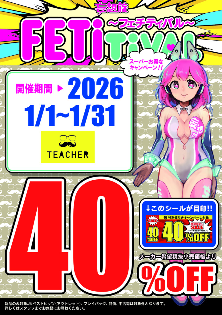 キャンペーン情報 ポイントカードについて 店舗情報 買取について 求人案内について 新品DVDキャンペーン(ティーチャー/妄想族) 40%オフ!! 2026年1/1日(木)~スタート!! 2026.01.01 (木) 吉島店 廿日市店 西条店 新品DVD[ティーチャー/妄想族] 40%オフキャンペーン スタートいたします!! キャンペーン詳細 新品DVDが対象です アウトレット、ベストヒッツ、中古商品 特価商品は対象外です。 新品価格(店頭販売価格)から40%オフとなります。 キャンペーン期間: 2026年1月1日(木)~2026年1月31日(土) 閉店時まで 開催店舗 東京書店吉島店 東京書店西条店 東京書店廿日市店 この機会にお近くの東京書店までお越しください。 ご来店お待ちしております。 眠れぬ夜は東京書店!! 一覧 TOPページ