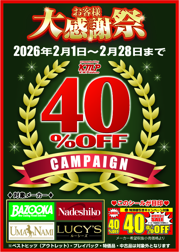 キャンペーン情報 ポイントカードについて 店舗情報 買取について 求人案内について 新品DVDキャンペーン(KMP 対象6メーカー) 40%オフ!! 2026年2/1日(日)~スタート!! 2026.02.01 (日) 吉島店 廿日市店 西条店 新品DVD40%オフキャンペーン スタートいたします!! キャンペーン詳細 新品DVDが対象です アウトレット、ベストヒッツ、中古商品 特価商品は対象外です。 新品価格(店頭販売価格)から40%オフとなります。 キャンペーン期間: 2026年2月1日(日)~2026年2月28日(土) 閉店時まで 開催店舗 東京書店吉島店 東京書店西条店 東京書店廿日市店 この機会にお近くの東京書店までお越しください。 ご来店お待ちしております。 眠れぬ夜は東京書店!! 一覧 TOPページ