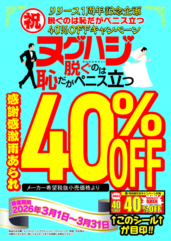 新品DVDキャンペーン(脱ぐのは恥だがペニス立つ) 40%オフ!! 2026年3/1日(日)~スタート!!
