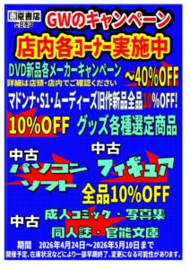 キャンペーン情報 ポイントカードについて 店舗情報 買取について 求人案内について ★廿日市店 ゴールデンウィークキャンペーン情報!★ 2026.04.24 (金) 廿日市店 廿日市店より、ゴールデンウィークキャンペーンのご案内です! 〇開催店舗 東京書店廿日市店 この機会にお近くの東京書店までお越しください。 ご来店お待ちしております。 眠れぬ夜は東京書店!! 一覧 TOPページ